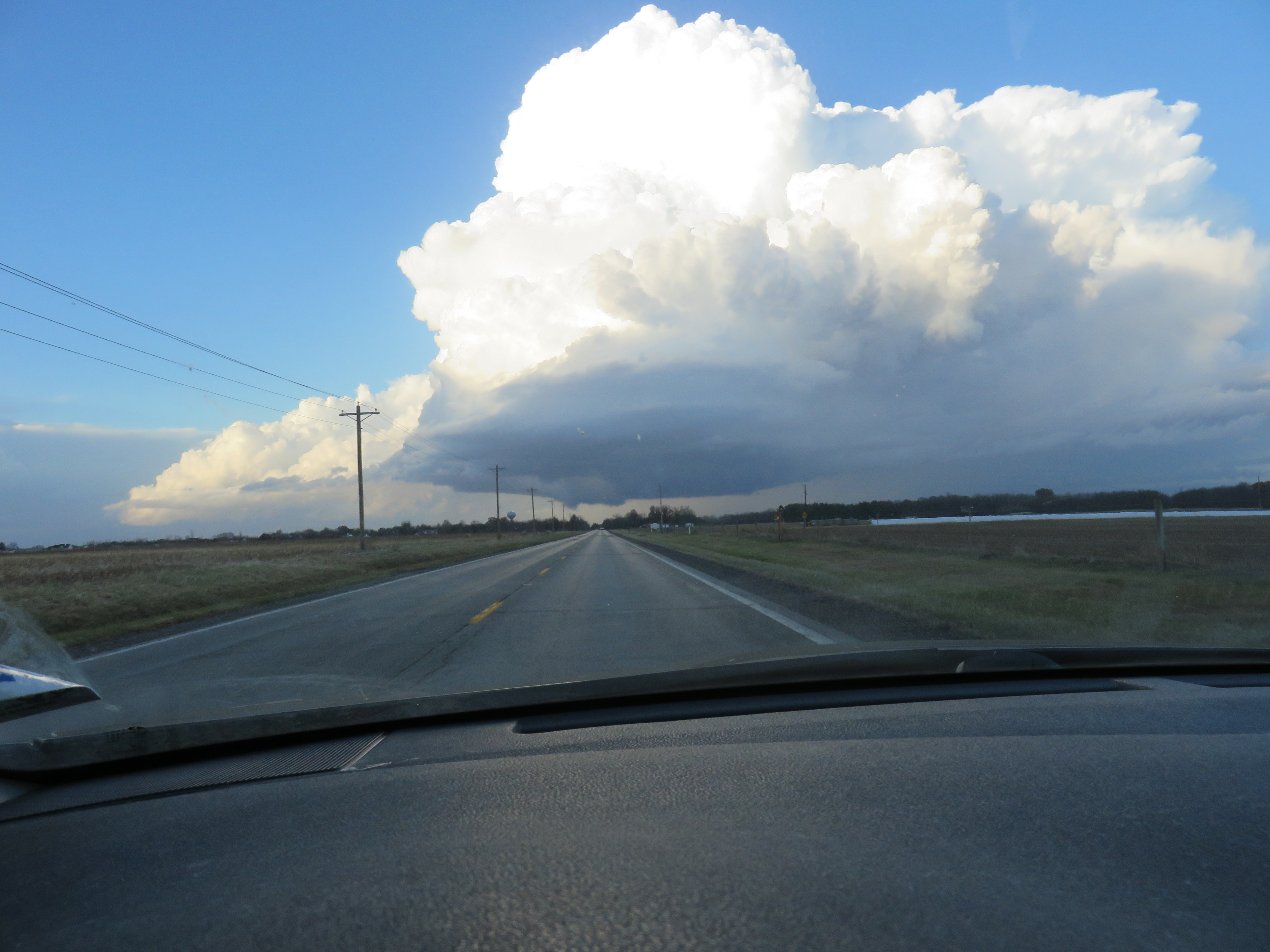 At around 3:50, I ventured back east to IL-4 to continue north. Almost immediately, the visual presentation of the storm improved, as evidenced by the photo below, shot along IL-4 approximately 1 mile south of IL-140 at 3:55 pm. A couple minutes later at 3:57 pm, a Severe Thunderstorm Warning was issued for the storm.