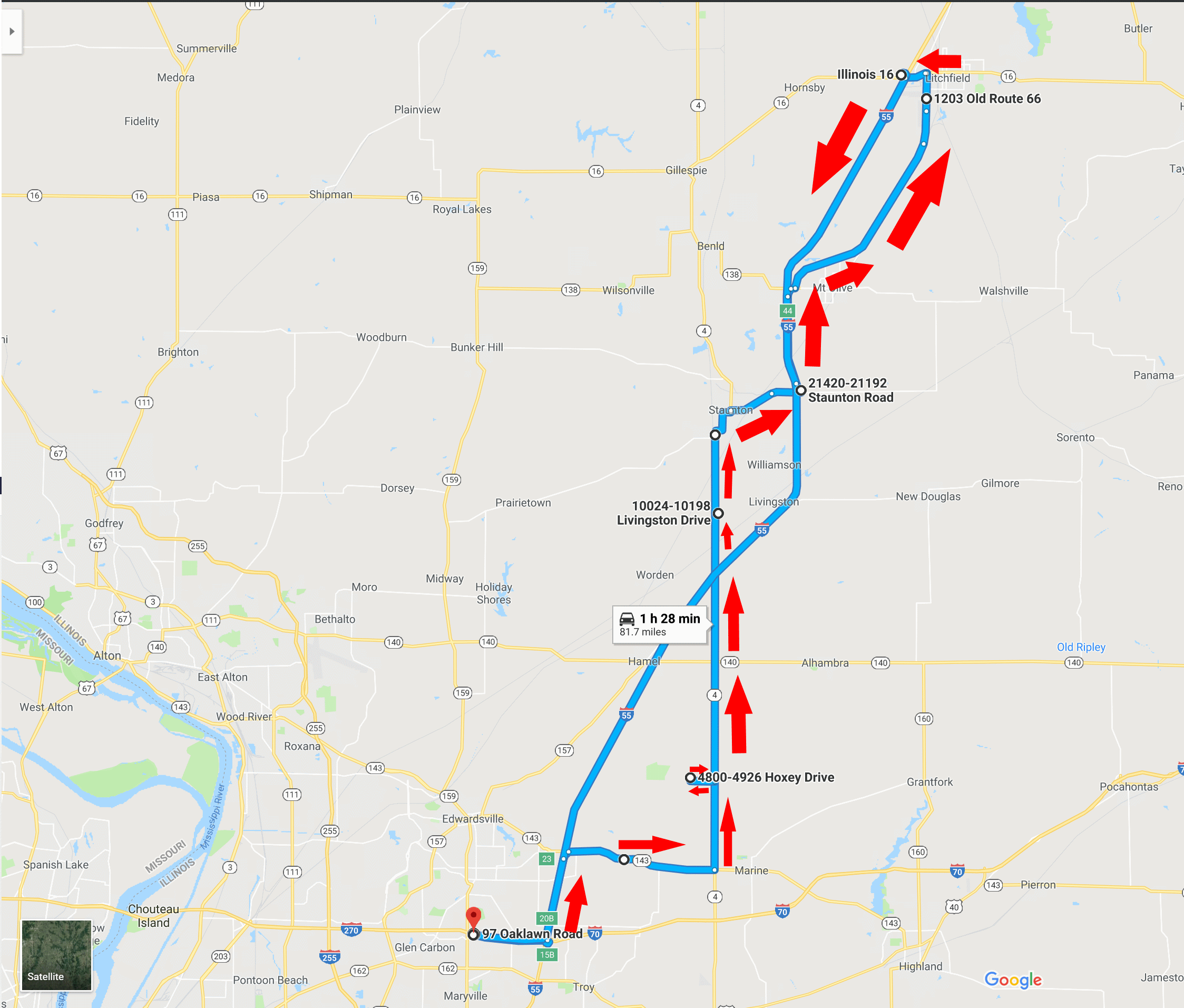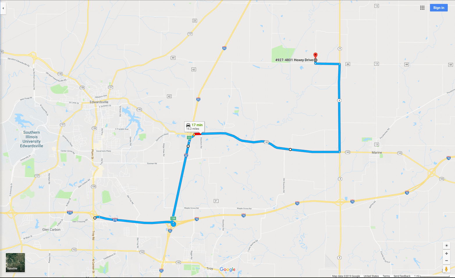 After watching the storm on radar for a few more minutes, I decided it was worth it to chase it and have a look. I left around 3:20 pm and proceeded to I-55 northbound to intercept. As I headed north, it was apparent the storm was going to cross I-55 near Hamel, IL and I did not want to drive directly into it on the interstate. I decided to take the exit for IL-143, go east until I could get on IL-4 north, and catch up with the storm.